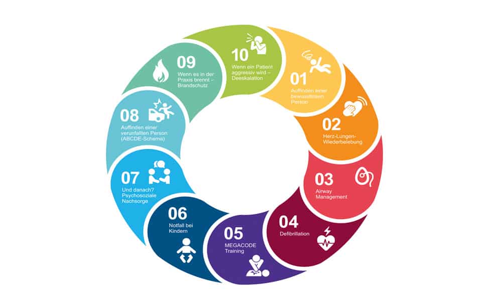 Morgens hilft ein einleitender Theorieblock dabei, die notfallmedizinischen Kenntnisse auf den aktuellen Stand zu bringen. Der Schwerpunkt des Seminartags liegt jedoch auf dem anschließenden praxisorientierten Training. Dazu werden die Teilnehmer in Kleingruppen aufgeteilt, die gemeinsam mit kompetenten Trainern unterschiedliche Aspekte von medizinischen und anderen Notfallsituationen durchspielen. An zehn Stationen geht es um praktische Übungen zu Situationen, die in einer Praxis typischerweise vorkommen können:
