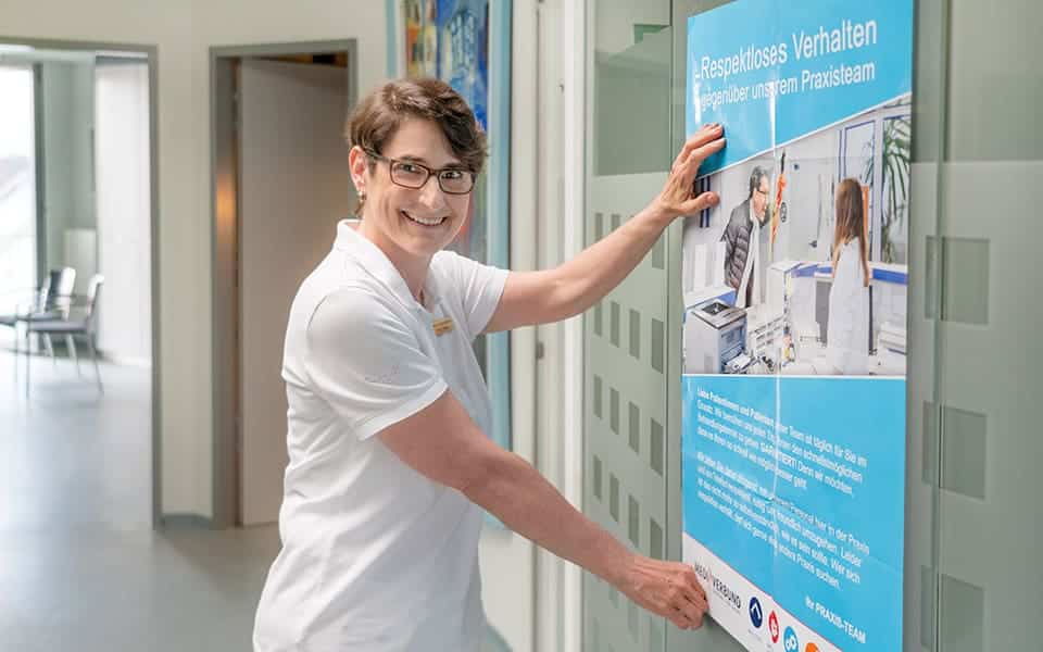 Elke Hecht ist MFA in einer Praxis für Allgemeinmedizin in Stuttgart. Fast täglich haben die 55-Jährige und ihre Kolleginnen dort mit unfreundlichen oder gar respektlosen Patientinnen und Patienten zu tun – leider. Das wollte der Praxisinhaber nicht länger hinnehmen und hat das MEDI-Plakat zum freundlicheren Umgang mit dem Personal bestellt. Seit zwei Monaten hängt es nun im Eingangsbereich der Praxis.
