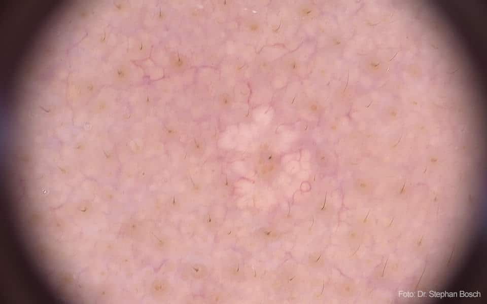 Die Dermatoskopie ist das Spezialgebiet der Ludwigsburger Praxis für Privatpatienten und Selbstzahler. Kein Wunder also, dass die MFA immer wieder geschult werden, interessante Fälle werden nahezu täglich besprochen. „Es macht schon viel Spaß, mit der Spezialkamera nach atypischen Strukturen zu suchen, die zum Beispiel an Popcorn, Spiegeleier mit Speck, Erdbeermuster oder Drachen erinnern“, sagt Strohm und ergänzt: „Es ist eine anspruchsvolle Aufgabe, die ins rechte Licht zu rücken, so dass richtige Diagnosen gestellt werden können“. Das Foto oben zeigt so eine Drachenstruktur, eine circumscripte Talgdrüsenhyperplasie.
