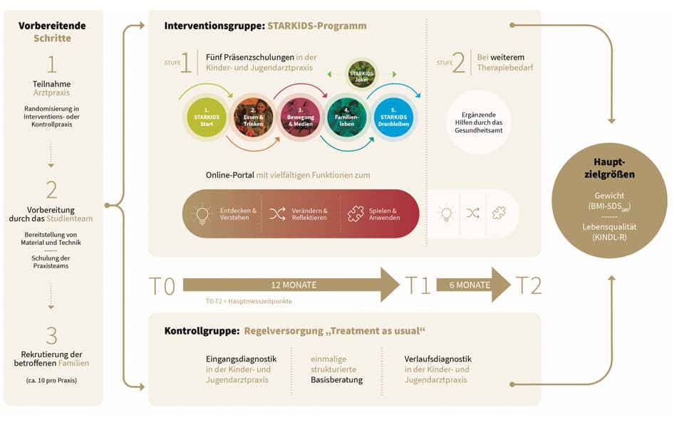 In der Studie werden je 500 Patienten in die STARKIDS- und die Kontrollgruppe eingeschlossen und nach Projektende im Hinblick auf Unterschiede ausgewertet. Interessierte Praxen können sich noch bis Ende Juni 2022 an der Studie beteiligen. Federführend entwickelt, gesteuert und wissenschaftlich evaluiert wird STARKIDS von der Medizinischen Universitätsklinik Tübingen als Konsortialführer und dem Gesundheitsamt Stuttgart als Projektpartner. Weitere Projektpartner sind die AOK Baden-Württemberg, die Universität Tübingen, das Zentralinstitut Seelische Gesundheit Mannheim, der CES Verlag und auf Ärzteseite der Berufsverband der Kinder- und Jugendärzte (BVKJ), die Hausärztliche Vertragsgemeinschaft und MEDI Baden-Württemberg.