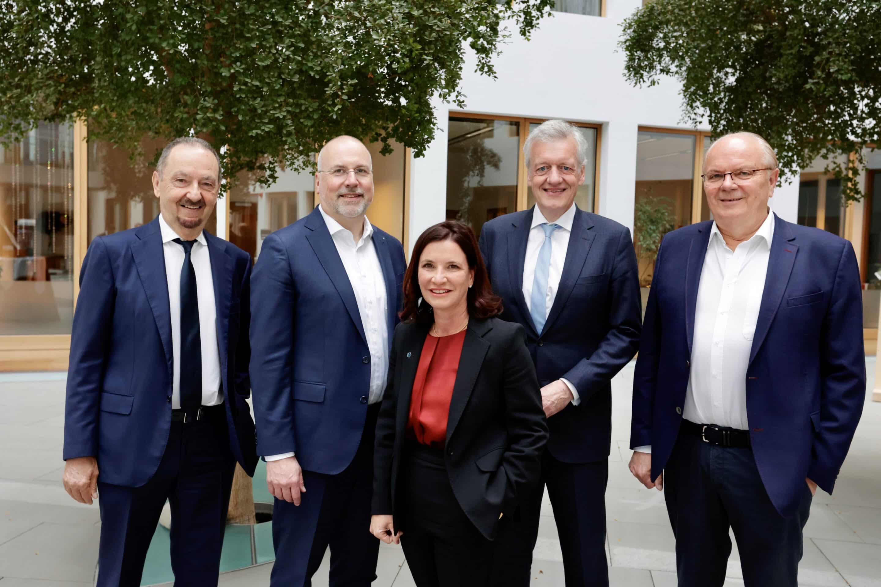 Pressefoto anlässlich der Pressekonferenz am 15. Mai in Berlin (Fotograf: Jens Schicke) (v.l.n.r.: Dr. Werner Baumgärtner Vorstandsvorsitzender von MEDI Baden-Württemberg und MEDI GENO Deutschland; Johannes Bauernfeind, Vorstandsvorsitzender AOK Baden-Württemberg; Prof. Dr. Nicola Buhlinger-Göpfarth, Vorsitzende des Hausärzteverbands Baden-Württemberg; Prof. Dr. Ferdinand M. Gerlach, Direktor des Instituts für Allgemeinmedizin der Goethe-Universität Frankfurt/Main; Prof. Dr. Joachim Szecsenyi, Senior Professor und langjähriger Ärztlicher Direktor der Abteilung Allgemeinmedizin und Versorgungsforschung des Universitätsklinikums Heidelberg)
