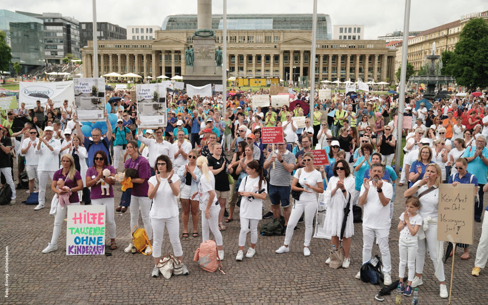 Rund 3.000 niedergelassene Ärztinnen und Ärzte, Zahnärztinnen und Zahnärzte und Psychotherapeutinnen und -therapeuten und ihre Teams haben am heutigen Mittwoch, 21. Juni 2023, vor dem neuen Schloss in Stuttgart gegen die aktuelle Gesundheitspolitik demonstriert. MEDI hatte zu der Protestveranstaltung aufgerufen – gemeinsam mit weiteren elf Berufsverbänden. Praxisteams aus ganz Baden-Württemberg nahmen an der Demonstration in der Landeshauptstadt teil. Ihre Forderung: Sicherstellung der ambulanten Versorgung und bessere Rahmenbedingungen für die niedergelassenen Praxen.