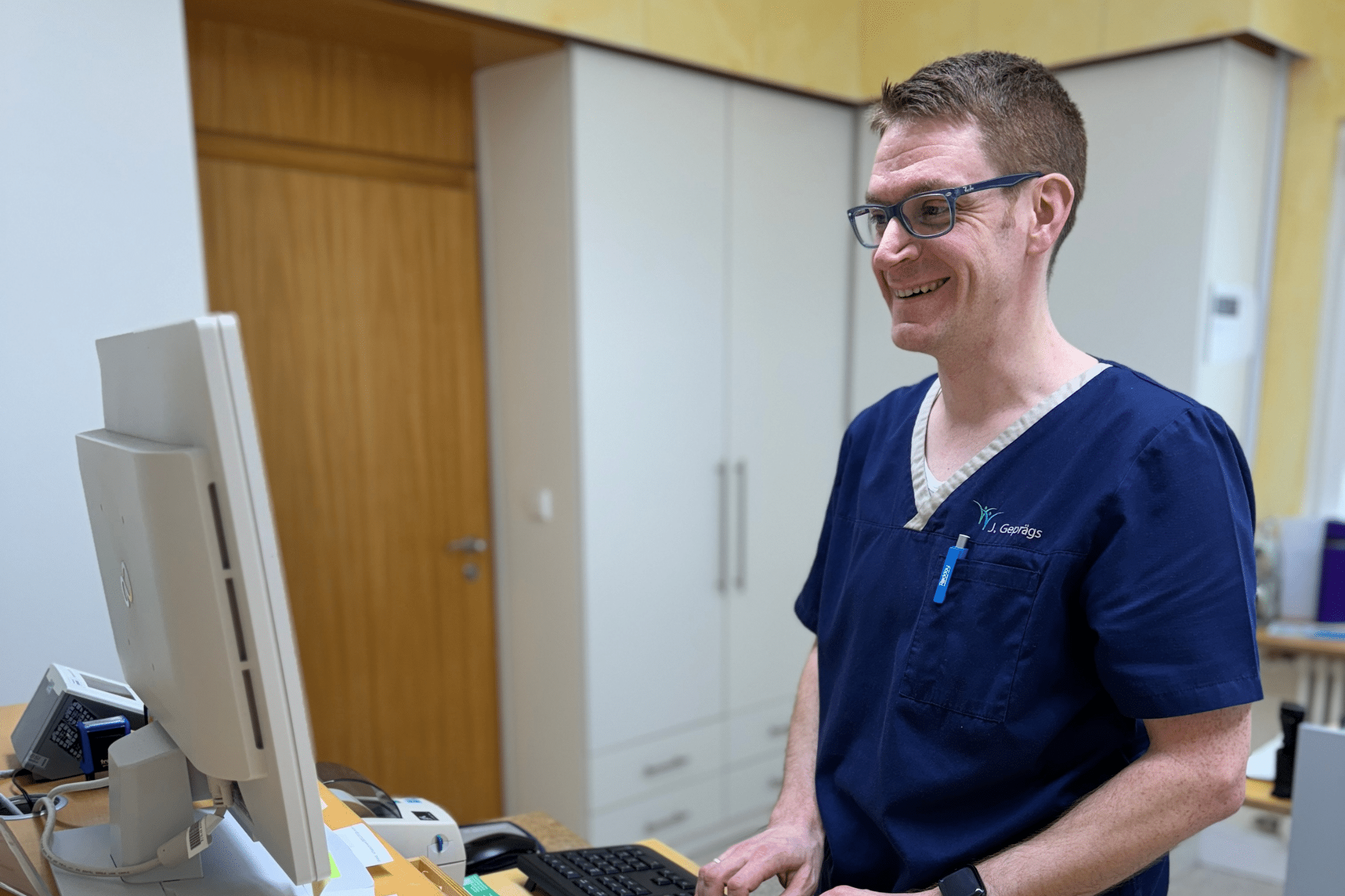 Schon in seiner Ausbildung war Johannes Geprägs der einzige Mann. Jetzt sei das kein Thema mehr. „Wenn man sich mit Frauen einigermaßen gut anstellt, hat man es gut“, schmunzelt der Lauterbacher. „Es ist, als ob wir schon immer miteinander arbeiten.“ Er übt die gleichen berufstypischen Tätigkeiten aus wie seine Kolleginnen – von der Anmeldung über Gespräche, das Assistieren bei Eingriffen bis zum Verbandswechsel. Die Arbeit macht ihm Spaß. Vor fünf Jahren hat er eine Zusatzausbildung zum Versorgungsassistenten in der Hausarztpraxis (VERAH) abgeschlossen. Eine Spezialaufgabe hat er in der Praxis allerdings: E-Rezept und Telematik. „Ich habe Ahnung davon“, sagt er und ist seinem ursprünglichen Informatik-Berufswunsch heute täglich sehr nah.