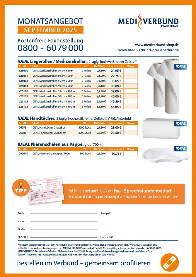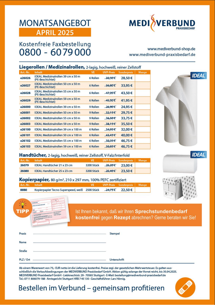 Kostenfreie Lieferung ab 75 € netto, die Bestellübersicht und der aktuelle Status Ihrer Bestellung sind jederzeit einsehbar und die Abrechnung erfolgt immer zu günstigen AEP. Sie haben noch Fragen? Wir sind unter info@mediverbund-praxisbedarf.de für Sie erreichbar.